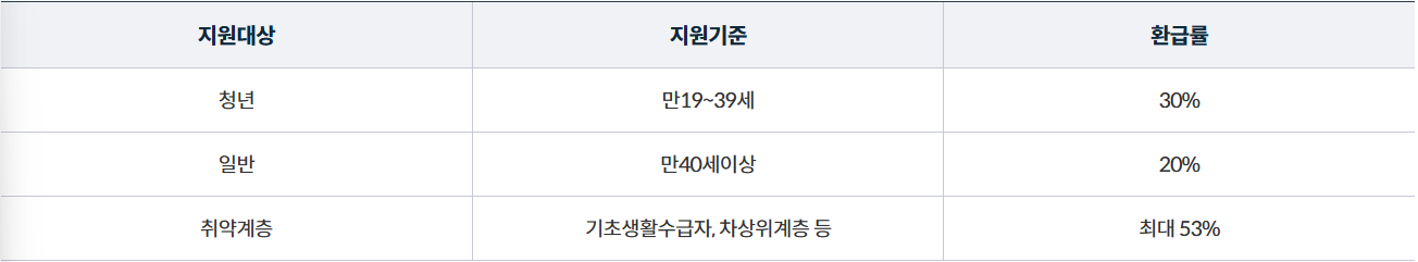 아래와 같은 기준으로 월 15회 이상 대중교통 이용 시 무제한으로 교통비를 일부 환급합니다.